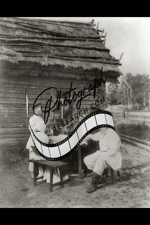 Group of Russian peasants posed at an outdoor table,c1875,balalaika,boy,cabin