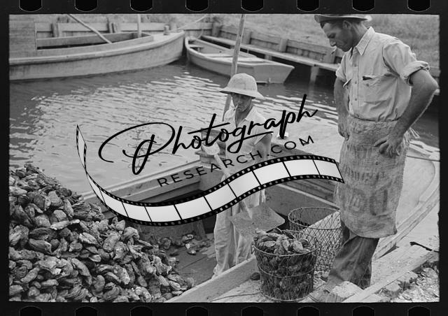 Dumping oysters into sacks from wire baskets,Olga,Louisiana,LA,FSA,1938,2