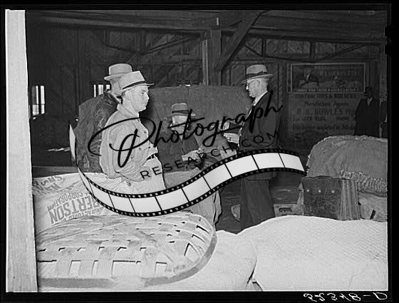 Title: When the tobacco is brought inside the warehouse on the trailer it is taken off the sticks and packed in baskets for the auction sale. Durham, North Carolina