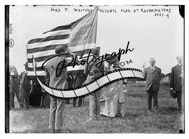 Mrs. P. Whitney presents flag at reformatory,American flag,group of men
