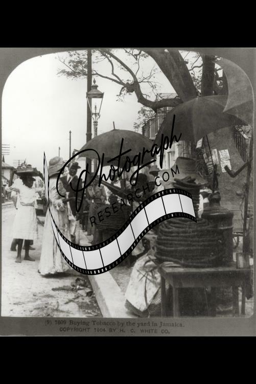 Buying tobacco by the yard in Jamaica,c1904,Street Market,Umbrellas,street lamp