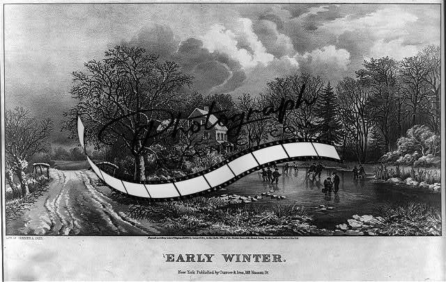 Early winter,c1869,people ice skating,home,road,snow,photograph