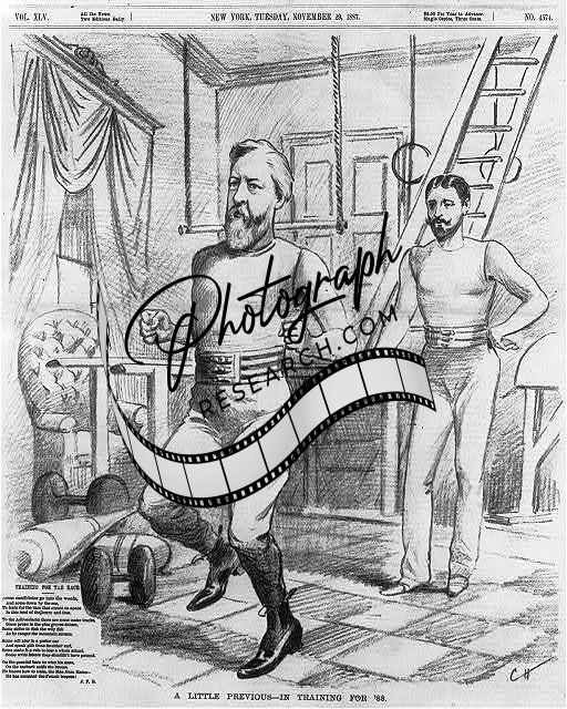 A little previous-in training,Political Cartoon,James G Blaine exercising,1887