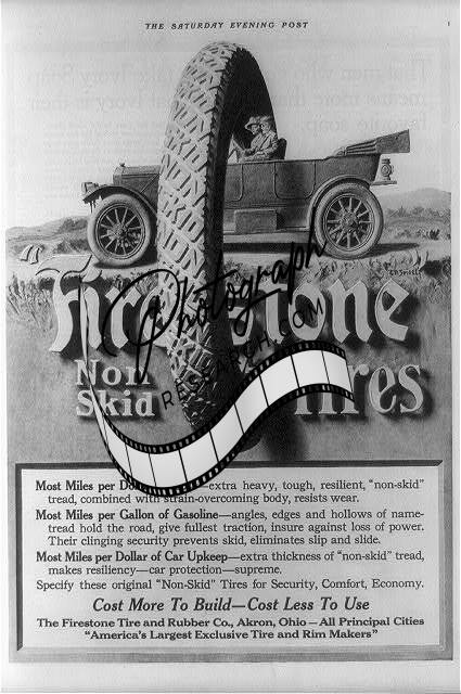 Firestone non-skid tires,automobiles,advertisment,miles,cost,CP Seidel,1912