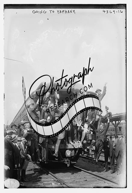 Going to Yaphank,men waving on back of train,RR,locomotive,Bain News Service