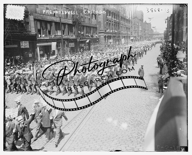 Preparedness Parade,Chicago,Illinois,IL,American flags,store fronts,people