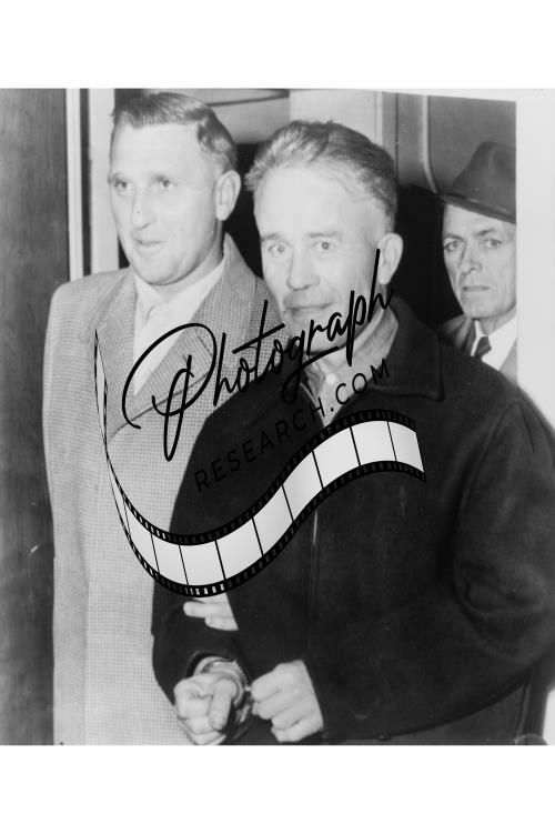 Ed Gein (center), handcuffed, half-length portrait, facing front, leaving the state crime lab in Madison, Wisconsin