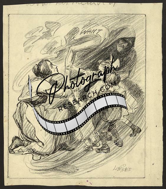 Cartoon,kneeling mother with three children,WWI,starvation,illness,Lute Pease