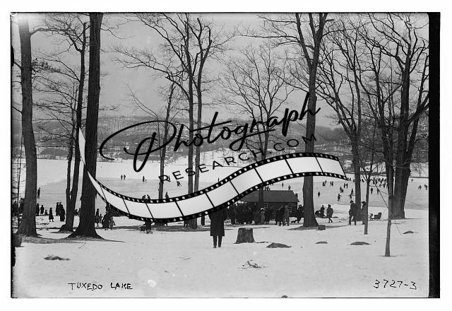 Tuxedo Lake,winter fun,ice skating,people,snow,building,bare trees,Bain News
