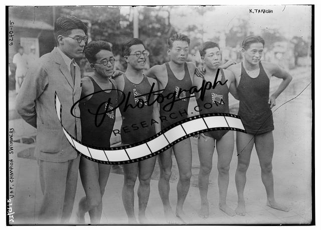 Japanese champion swimmers,men,athletes,bathing suits,flags,teams,pools,1926
