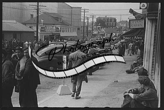 Title: Workers lounging around town and waiting for a lift home at afternoon change of shift of Electric Boat Works, Groton, Connecticut
