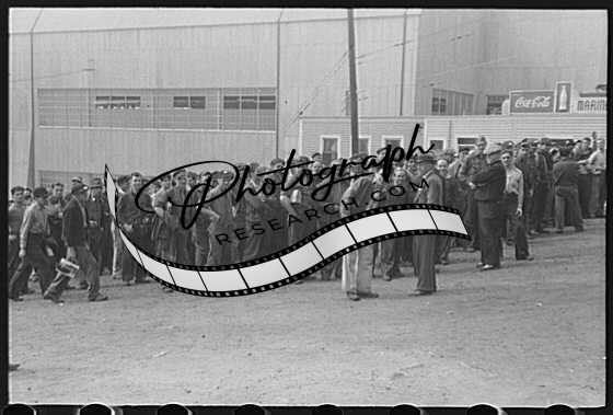 Title: Workers leaving plant at change of shift before being paid off. Electric Boat Works, Groton, Connecticut
