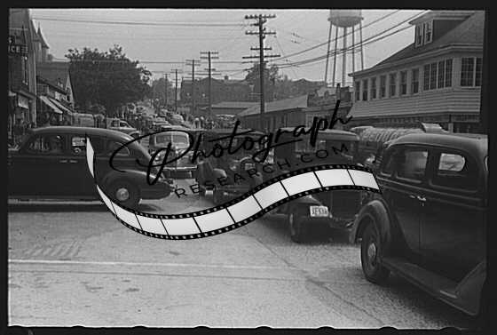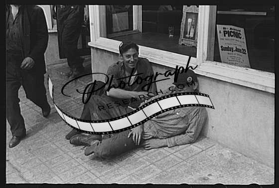 Title: Workers lounging around town and waiting for a lift home at afternoon change of shift of Electric Boat Works, Groton, Connecticut