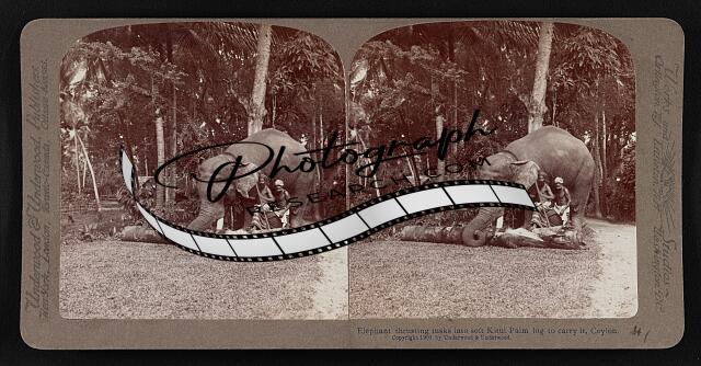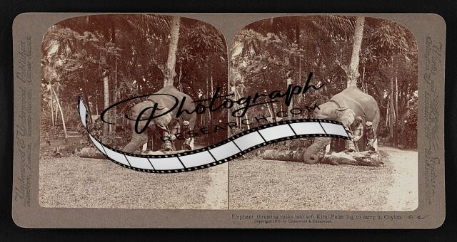 Elephant thrusting tusks into soft Kitul palm log to carry it, Ceylon