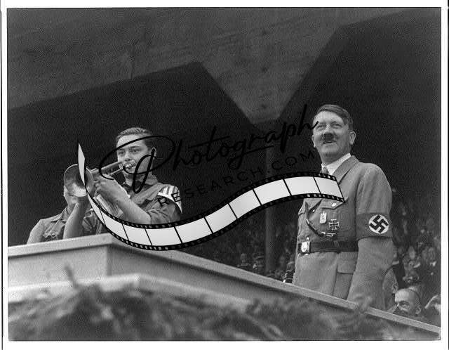 Hitler on platform next to youth playing bugle, Nuremburg