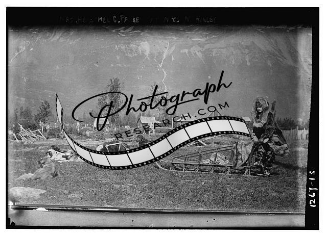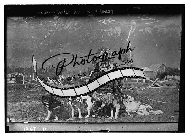 Mrs. H.C. Parker at Mt. McKinley,Alaska,AK,four dogs,dog sled,buildings