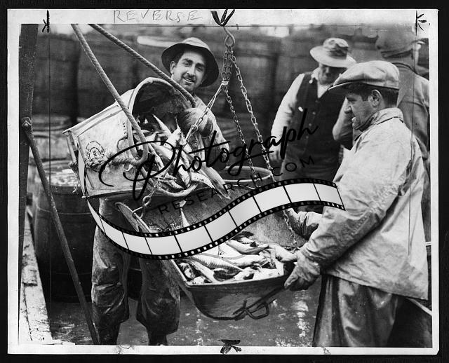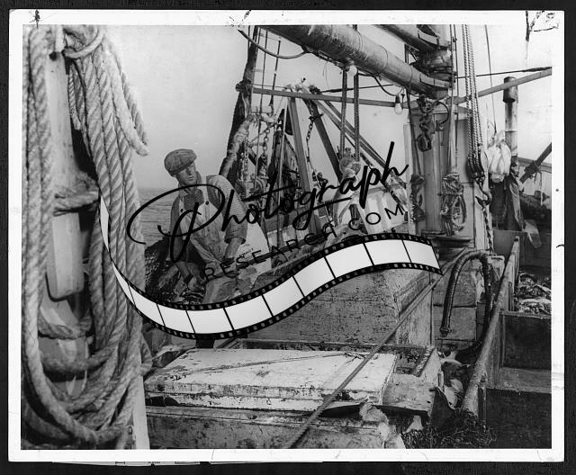 Fisherman on a trawler off the Georges Banks heaving fish into tank(?)