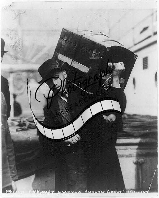 Polish emigrant boarding ship,he carries trunk on his shoulders,November 18,1907