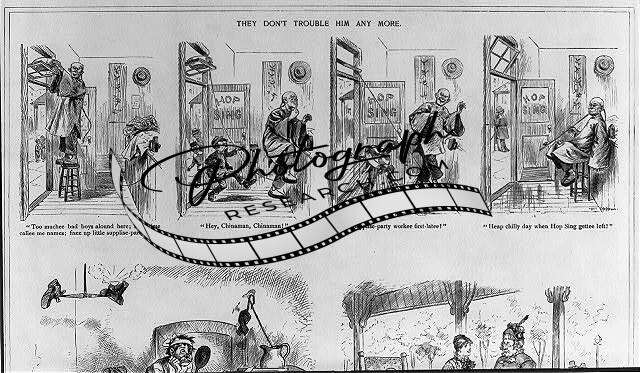 Cartoon,Chinese-American shopkeeper,playing trick,1888