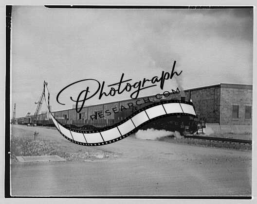 Title: Elmira Holding and Reconsignment Point, Elmira, New York. View through warehouses, locomotives in foreground