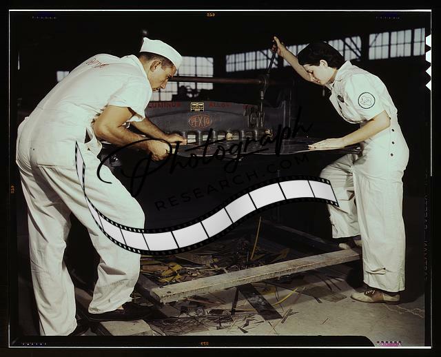 Title: Formerly a sociology major at the University of Southern California, Mrs. Eloise J. Ellis (right) now 'keeps 'em flyin'' at the Naval Air Base, Corpus Christi, Texas. She is a supervisor under civil service in the Assembly and Repair Department. It is her job to maintain morale among the women by helping them solve housing and other personal problems. With her is Jo Ann Whittington, an NYA trainee at the plant