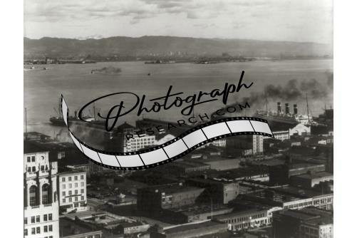 San Francisco,CA,waterfront,snow-capped tip of Mt Diablo,East Bay Hills,c1930s