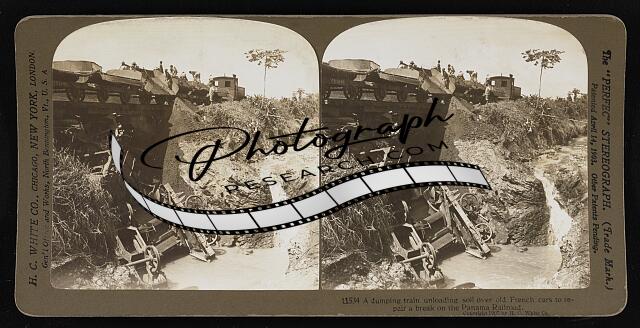 A dumping train unloading soil over old French cars to repair a break on the Pan