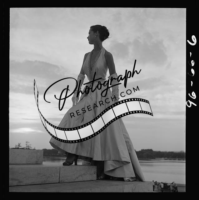 Fashion model posing,evening gown,steps,Tidal Basin,Jefferson Memorial,1949 2