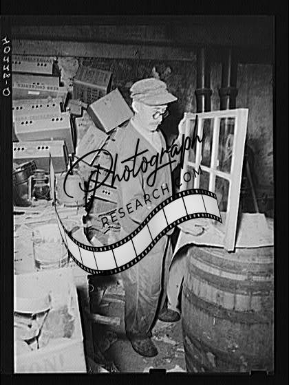 Title: Lancaster County, Pennsylvania. Eggs on the homemade moisturater in the cellar of the chicken house on the Enos Royer farm. A long box contains a tray of water, upright pieces of blotting paper which act as wicks, and a fan which forces air into one end of the box and up through holes on the top of the box, into the screen-bottom pails which contain the eggs. The eggs go to market twice a week