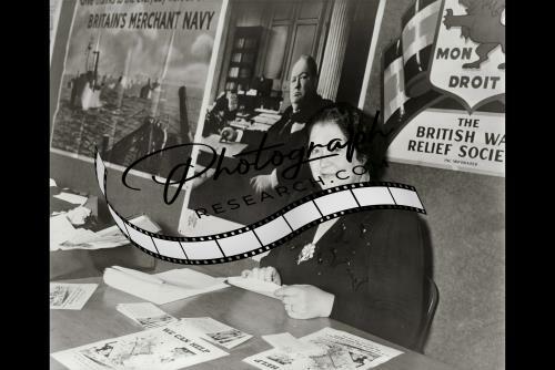 Mrs. Alois Hitler, half-length portrait, seated at table offering British war relief information, facing front; similiar posters on wall behind her