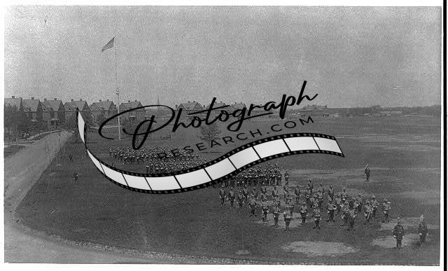 U.S. Army units in full dress on parade grounds,led by band,drill field,1880's?