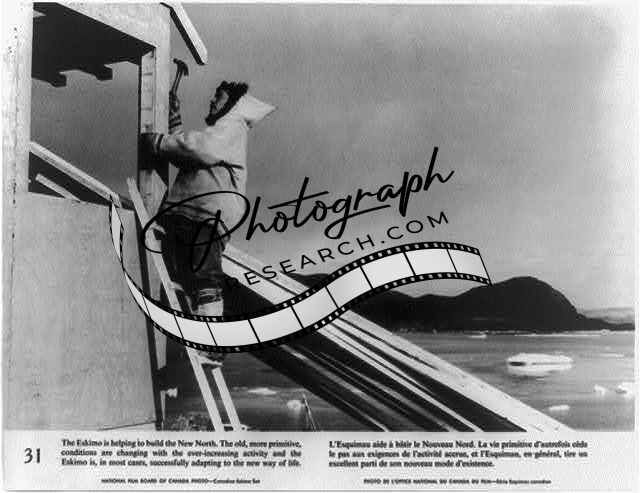 Northern Canada: Eskimo on ladder building house,c1956,Building,construction