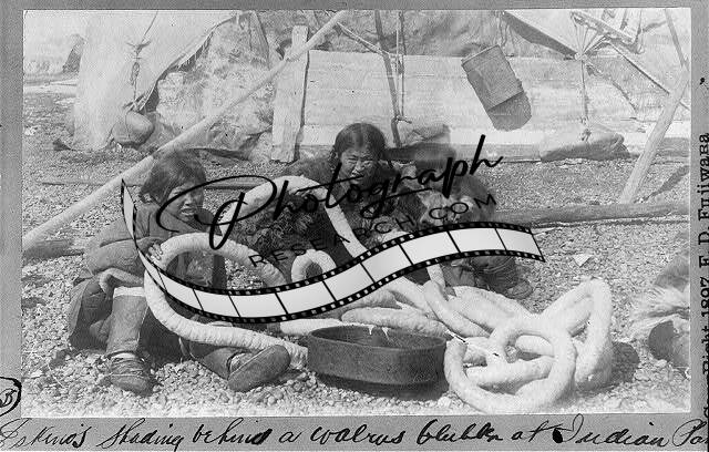 Eskimos shading behind a walrus blubber at Indian Point,c1897