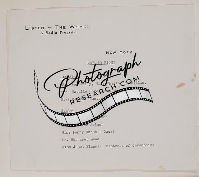 Listen,women,radio program,Mrs Chester Arthur,Fanny Hurst,Margaret Mead,1944