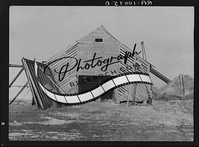 Title: Barn on J.E. Herbrandson farm near Estherville, Iowa. Owner-operated. This farm is under heavy mortgage. It was bought originally at two hundred dollars per acre in fall of 1919. Pressure to keep up payments has resulted in general disrepair. Payments made up to April, 1936. Owner had to sell this year's crop to make payment. He is one year behind because of poor crops and high interest