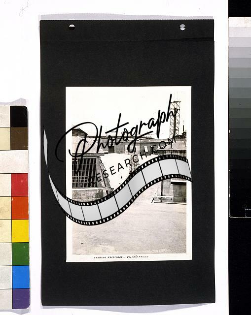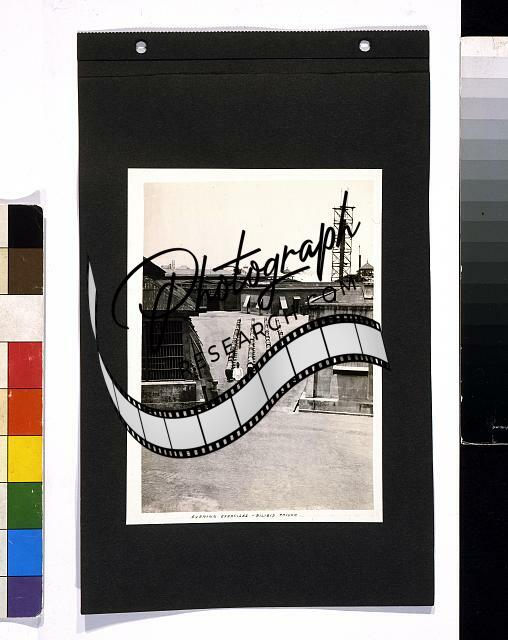 Summary: Photograph shows prisoners in formation, stretching hands over heads, in courtyard, Bilibid Prison, Manila, Philippines.