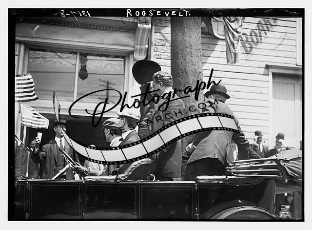 President Theodore Roosevelt in car,waving to spectators,US Flags,automobile