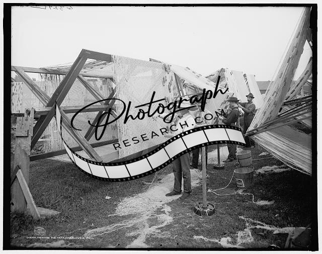 Mending nets,fishing industry,nets,workers,docks,Charlevoix,Michigan,MI,c1906