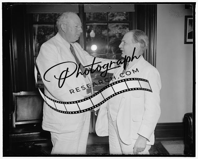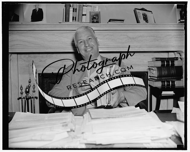 Title: Exhausted after wage-hour fight in senate. Washington, D.C., June 13. Senator Allen Ellender Democrat of Louisana and onetime Lieutenant of the late Huey Long, is snapped by news cameramen as he rests in his office after leading the victorious fight for the compromise in the wage-hour bill. The compromise is expected to make wage differentials possible for many southern industries. He has threatened a filibuster unless the south got what it wanted in the measure, 6/13/38