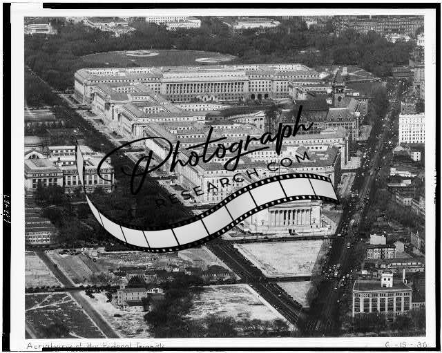 Aerial viewbuildings,streets,government,Federal Triangle,Washington DC,1936