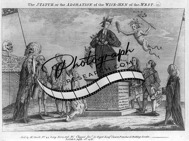 Summary: Print shows a group of British politicians sitting and standing around a table in a public house or club reading the latest news of a dispatch from General Henry Clinton possibly referring to his evacuation of Philadelphia in June 1778. On the wall in the background are maps of the English possessions in America, the first, a large map showing extensive holdings in 1762 when William Pitt was prime minister, and the second, a much smaller map showing reduced holdings filled with snakes in 1778. To the right is a picture of a mountain, 'The mountain in labor', from beneath which emerges a mouse; several people standing around the mountain point to the mouse in amazement.