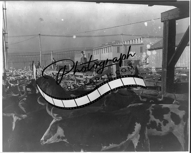 Chicago stock yards,Illinois,IL,c1900,Cattle in pens,Meat Industry,Men on fence