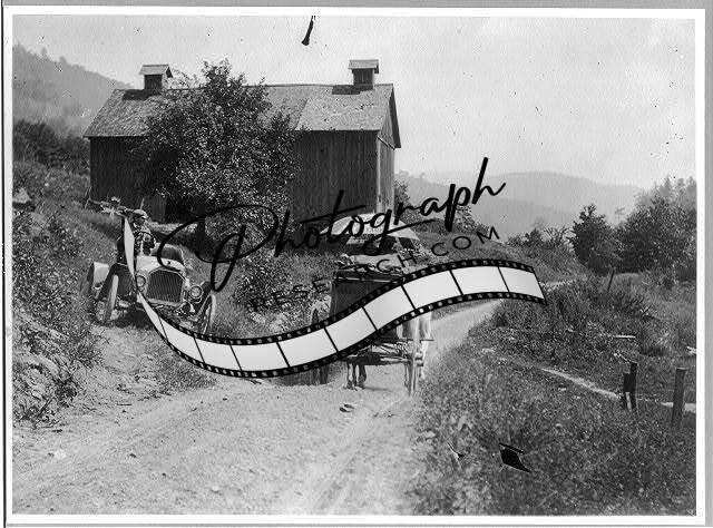 Buicks roadster waits for horse-drawn wagon to pass on country road,Liberty,NY