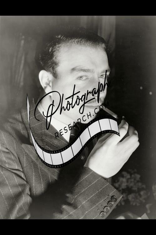 William Patrick Hitler, head-and-shoulders portrait, facing right, lighting a cigarette aboard the S.S. Normandie arriving in New York