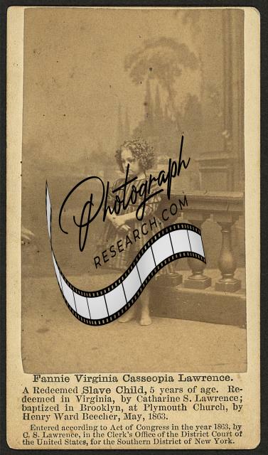 Caption below image: 'A redeemed slave child, 5 years of age. Redeemed in Virginia, by Catharine S. Lawrence; Baptized in Brooklyn, at Plymouth Church, by Henry Ward Beecher, May, 1863'.