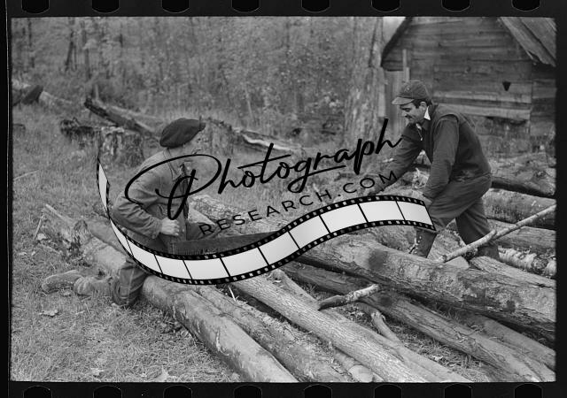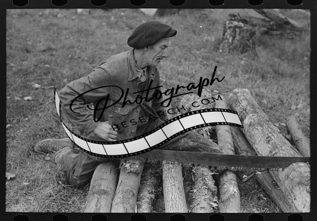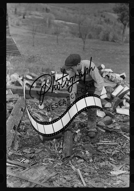 Title: Splitting wood, getting ready for the winter, on farm near Bradford, Vermont