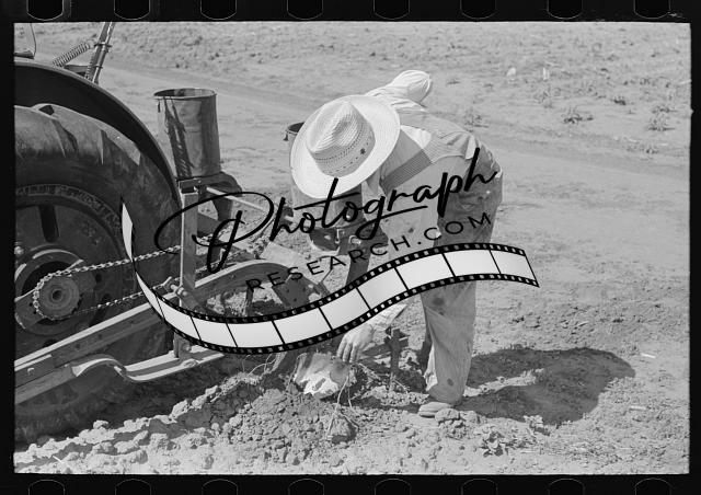 Title: Day laborer putting chain onto feeder gear of planter on farm near Ralls, Texas