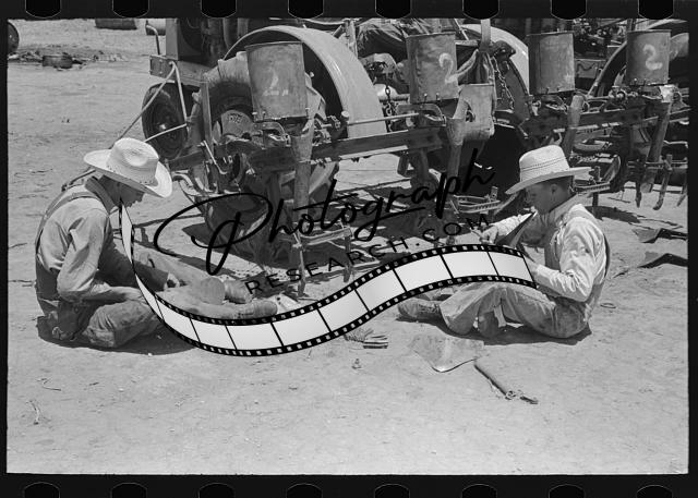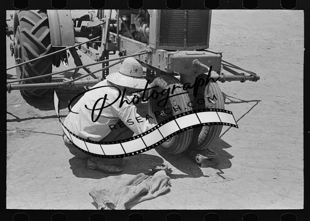 Title: Son of day laborer sitting in tractor seat, large farm near Ralls, Texas