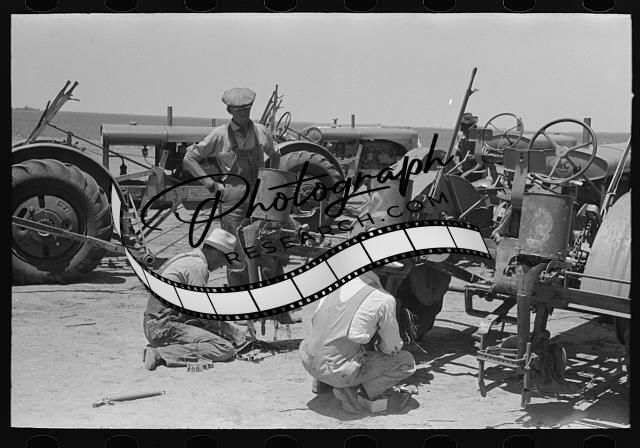 Title: Day laborer adjusting plow points on tractor-drawn planter, farm near Ralls, Texas