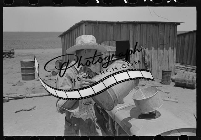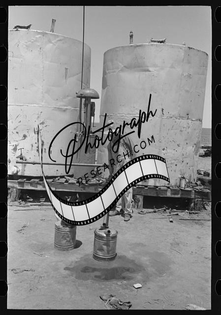 Title: Day laborer changing plow points on tractor-drawn four-row planter. Gasoline tanks in the background, large farm near Ralls, Texas